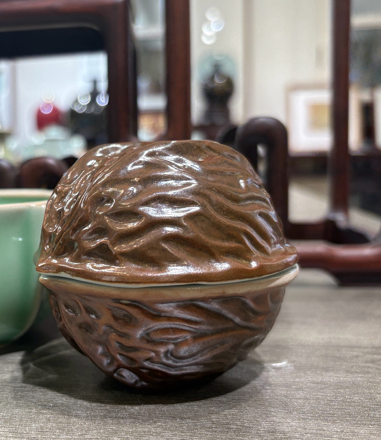 这几天,徐乔的创新手作——一件核桃形状的手抓壶格外引人注目。这件作品巧妙地将天目窑文化与临安山核桃相结合,打造出极具地方特色的文创产品。手抓壶外观呈核桃形,内部还藏有两个一大一小的核桃状小杯子,将两个小杯子往上一扣,便是一个完整的核桃形状,设计精妙,携带方便。“很多人对这个很感兴趣,在制作过程中,因为制作周期比较长,我反复修改,就有很多人想要购买,询问购买方式。”徐乔笑着说,“我们用宋代天目窑的工艺,结合现代审美和临安地方特色文化,制作了很多天目瓷。”
