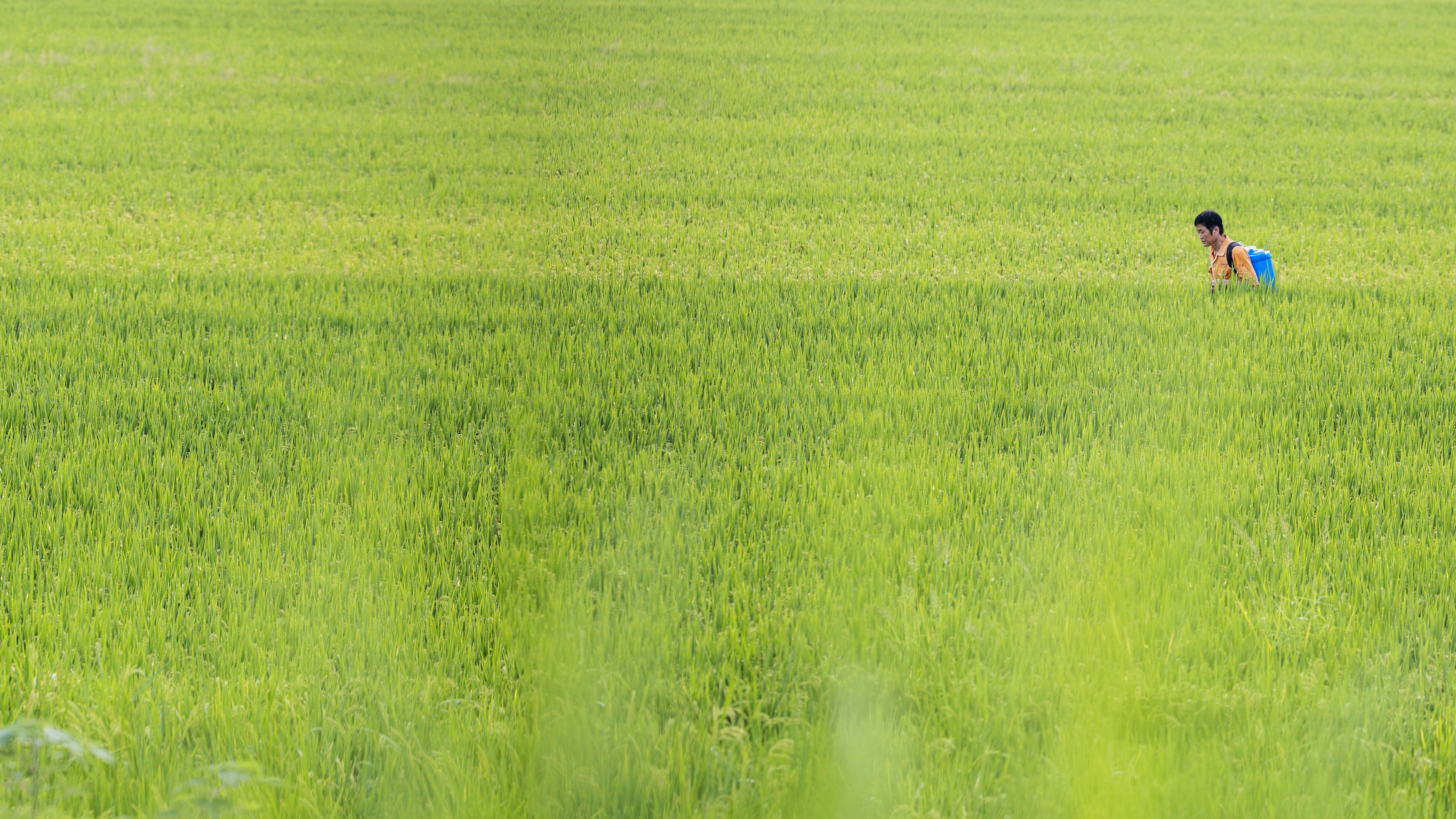 站在堤坝上,我举着相机,大片的稻田碧绿起伏,铺展开去。农妇背着水箱走进稻田,她穿着黄色的外衣,身影小小,在稻浪间格外醒目,她走得极快,唰唰唰掠过田埂,动作麻利。她在田边给玉米洒完水,又折身快步走向电瓶车,跨上去,喊上小黄狗,疾驰而去。我透过镜头看着她,此刻,她就是我的模特,稻田的女主角。