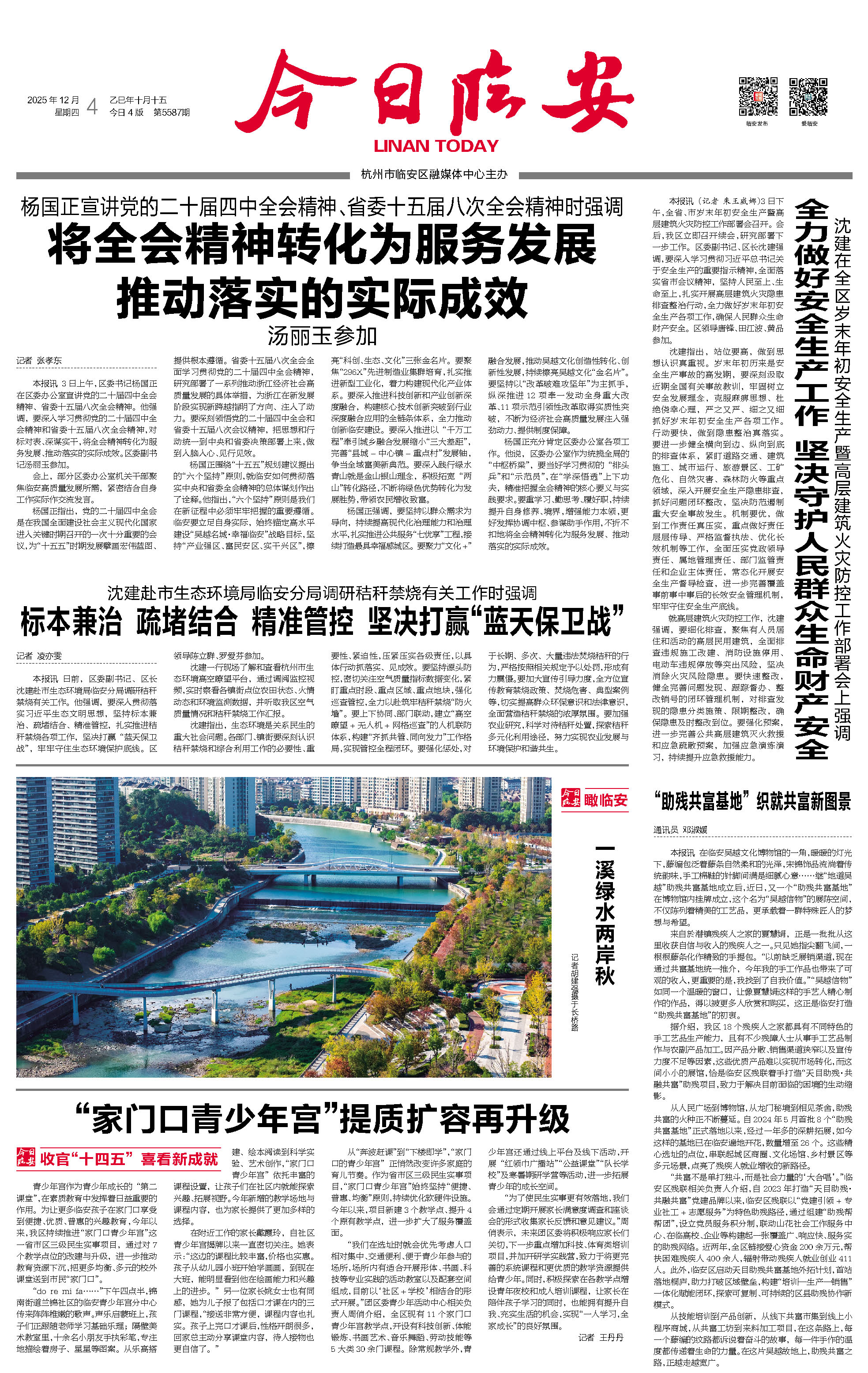 杨国正指出,党的二十届四中全会是在我国全面建设社会主义现代化国家进入关键时期召开的一次十分重要的会议,为“十五五”时期发展擘画宏伟蓝图、提供根本遵循。省委十五届八次全会全面学习贯彻党的二十届四中全会精神,研究部署了一系列推动浙江经济社会高质量发展的具体举措,为浙江在新发展阶段实现新跨越指明了方向、注入了动力。要深刻领悟党的二十届四中全会和省委十五届八次会议精神,把思想和行动统一到中央和省委决策部署上来,做到入脑入心、见行见效。